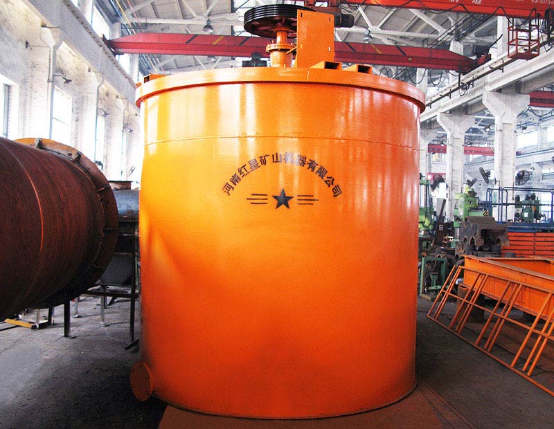攪拌桶由電動機、葉輪、定子、軸承等部件組成,采用平底桶形輻射循環螺旋葉輪機械攪拌式方法進行攪拌作業。攪拌槽工作時電動機牽引三角帶傳動裝置帶動葉輪旋轉,礦漿和藥劑在葉輪的勻速攪拌作用下實現充分的相互混合,增加藥劑對礦漿的反應時間,對藥物的反應質量進行強化,從而使物料得到充分的攪拌和混合,為下一階段的浮選機生產做好必要的準備條件。