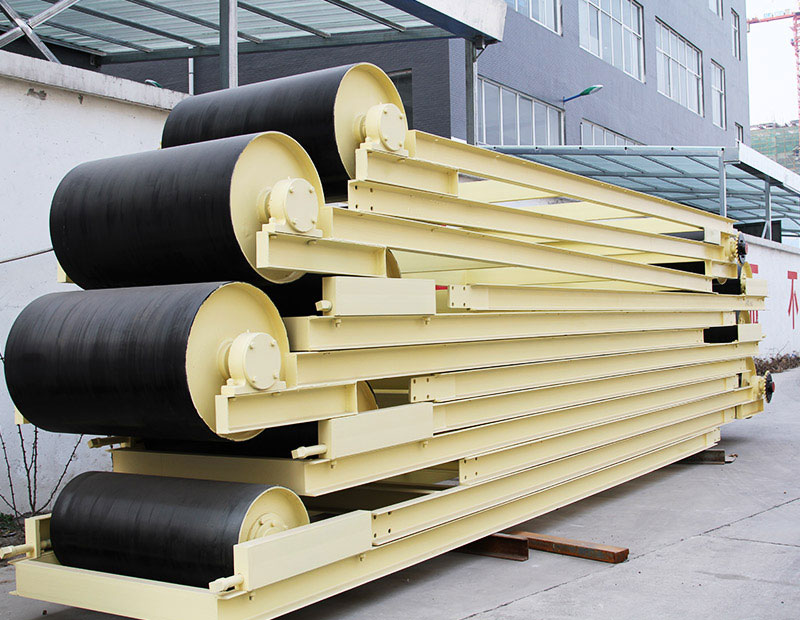 膠帶輸送機主要由機架、輸送皮帶、皮帶輥筒、張緊裝置、傳動裝置等組成。機身采用優質鋼板連接而成 ,由前后支腿的高低差形成機架,平面呈一定角度傾斜。機架上裝有皮帶輥筒、托輥等,用于帶動和支承輸送皮帶。